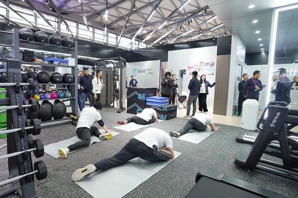 一进入333展位,参观者如踏入真实的健身门店中,经过前台和洽谈区,进入体测区,可以了解自己的身体状况,为接下来的健身计划提供科学依据。根据用户需求的差异性,以“体能-体脂-体型”进阶为参照,333健身会为用户规划出不同的课程类型,针对不同阶段的用户,匹配不同的授课内容及教练。展区还设有专业私教、特色团课以及设备体验区,参展观众可以在此亲身体验健身器材和优质健身课程,咨询健身教练,服务内容包含门店所有私教、小班课及器械使用指导,极具专业性和针对性。